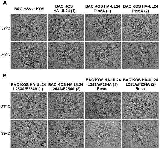 Mutations targeting the UL24 NES result in syncytial plaques. Representative plaques observed at 37 °C and 39 °C on Vero cells: (A) Plaques produced by the viruses BAC HSV-1 KOS, BAC_KOS HA-UL24 (1), and BAC_KOS HA-UL24 T195A (1) and (2). (B) Plaques produced by the viruses BAC_KOS HA-UL24 L253A/F254A (1) and (2) and BAC_KOS HA-UL24 L253A/F254A (1) Resc and (2) Resc.