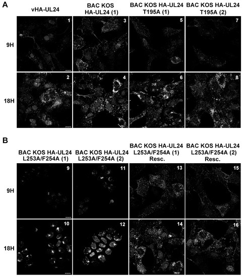 We investigated the subcellular distribution of HA-UL24 protein following infection by the different recombinant viruses (Figure 8). Vero cells were infected with the indicated virus at an MOI of 10. At 9 and 18 hpi, cells were fixed, and the subcellular localization of HA-UL24 was analyzed via indirect immunofluorescence and confocal microscopy. At both 9 and 18 hpi, we observed that UL24 localized in the nucleus and the cytoplasm with some nucleolar staining in BAC_KOS HA-UL24 (1)-infected cells in a manner similar to that observed previously for vHA-UL24 [14] (Figure 8A, panels 1,3). At 18 hpi, HA-UL24 was distributed in the nucleus and the cytoplasm with prominent perinuclear staining (Figure 8A, panels 1–4). Similar patterns were observed at 9 and 18 hpi in cells infected with either isolate of BAC_KOS HA-UL24 T195A (Figure 8A, panels 5–8). In contrast, HA-UL24 remained entirely nuclear in cells infected with either isolate of BAC_KOS HA-UL24 L253A/F254A, which encodes a UL24 protein with an altered NES sequence (Figure 8B, panels 9–12). In cells infected with the rescue viruses, HA-UL24 was distributed in the nucleus and the cytoplasm (Figure 8B, panels 13–16) in a manner similar to that observed for the BAC_KOS HA-UL24 (Figure 8A, panels 3–4). These results indicate that, during infection, HA-UL24 shuttles between the nucleus and the cytoplasm due to the presence of the NES we identified in the C-terminal domain of the protein.