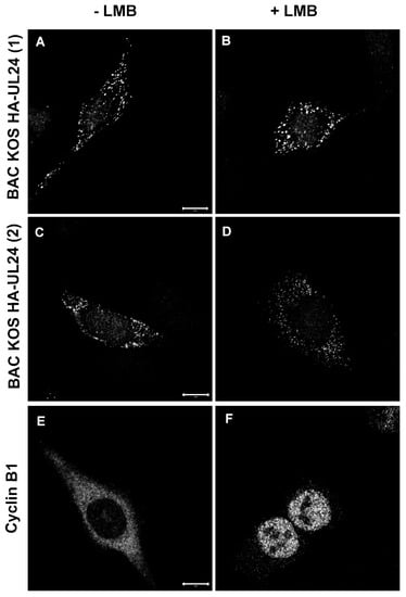 To determine whether the nuclear export of HSV-1 UL24 is mediated by CRM-1 during infection, HeLa cells were infected with either isolate of BAC_KOS HA-UL24. At 8 hpi, cells were either treated with vehicle alone or treated with 20 ng/mL LMB for 5 h (Figure 9A–D). To validate our experiment, mock-infected HeLa cells were similarly treated with LMB and processed for indirect immunofluorescence with a monoclonal antibody directed against Cyclin β1, which contains a CRM-1-dependent NES [43] (Figure 9E,F). Although LMB blocked the nuclear export of HA-UL24 in transient transfection assays (Figure 5), the treatment of infected cells with LMB had no effect on the localization of HA-UL24 protein (Figure 9A–D). In contrast, LMB inhibited the nuclear export of Cyclin β1, which was used as a positive control (Figure 9E,F). These results suggest that the nuclear export of HA-UL24 is either mediated by an export pathway other than CRM-1 during infection or that there is redundancy with other export pathways in the infected cells.