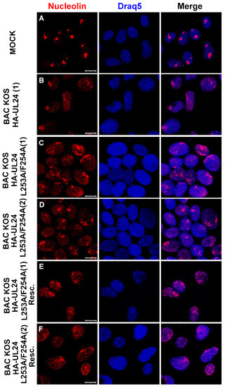 One of the known activities of UL24 is to induce the dispersal of nucleolin from nucleoli throughout the nucleoplasm [8,14]. It is also known that nucleolin can shuttle between the nucleus and the cytoplasm and that it can associate with the plasma membrane via its glycine–arginine-rich (GAR) domain [44,45,46]. Therefore, we investigated whether the nuclear export of UL24 plays a role in the dispersal of nucleolin. Vero cells were grown on coverslips and either mock-infected or infected with BAC_KOS HA-UL24 (1), BAC_KOS HA-UL24 L253A/F254A (1) and (2), or the rescue viruses. At 18 hpi, cells were fixed, and the distribution of nucleolin was analyzed via indirect immunofluorescence and confocal microscopy (Figure 10A–F). As expected, nucleolin staining was almost exclusively nucleolar in mock-infected cells. In contrast, both isolates of BAC_KOS HA-UL24 L253A/F254A, which encode an altered NES sequence, retained the ability to disperse nucleolin throughout the nucleoplasm similar to that observed for BAC_KOS HA-UL24 and the rescue viruses (Figure 10B–F). These results indicate that the redistribution of nucleolin does not depend on the ability of UL24 to shuttle between the nucleus and the cytoplasm.