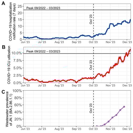 Monitoring the new genomic variants of severe acute respiratory syndrome coronavirus 2 (SARS-CoV-2) is crucial in addressing the public health challenge posed by COVID-19 []. Unfortunately, many countries have scaled down surveillance efforts, resulting in decreased PCR testing and thereby sequencing. Consequently, the number of genomic sequences of SARS-CoV-2 from patients submitted to GISAID for Germany decreased from 24,115 in October 2022 to 1401 in October 2023 and for Berlin it decreased from 944 to 220 in the same period []. Wastewater testing for SARS-CoV-2 has been proven useful to assess the quantitative occurrence of human SARS-CoV-2 infections [] and the presence and distribution of SARS-CoV-2 lineages and sublineages [,]. Here, we present the recent emergence and dominance of the BA.2.86 sublineage JN.1, identified through specific markers in wastewater. This coincides with an increase in the hospitalization incidence and the proportion of patients in intensive care units with SARS-CoV-2 infections in Berlin.