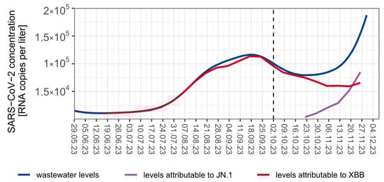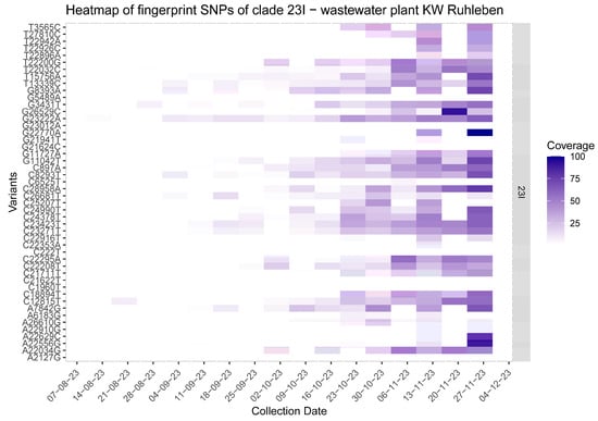 Initiated in December 2021, genomic monitoring of SARS-CoV-2 in Berlin’s wastewater promptly identified JN.1, with its sequence information available within 96 h of sampling. In contrast, patient-derived SARS-CoV-2 sequences took 2–3 weeks from sampling to submission to the national database hosted by the Robert Koch Institute (see Supplementary Materials) [,]. Wastewater surveillance offers a cost-effective and timely assessment of circulating variants in the entire urban area of Berlin, based on just one sample each week per treatment plant.
