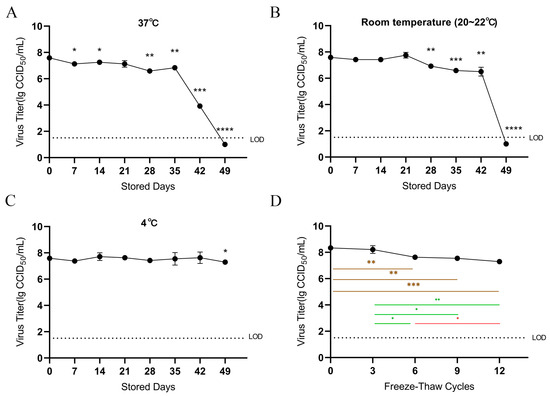 The stability of temperature and freeze–thaw cycles. Stability of mpox virus (MPXV) at 37 °C (A), room temperature (20~22 °C, (B)), or 4 °C (C). The MPXV aliquots stored at 37 °C (A), room temperature (20~22 °C, (B)), or 4 °C (C) were titrated every seven days according to Karber’s (Ramakrishnan, 2016) method. Results are expressed as the mean±standard deviation of 3 independent experiments (n = 3). Limit of detection (LOD), 1.5 log10 (lg) 50% cell culture infective dose (CCID50) per milliliter. (D) The virus titer stability after repetitive freeze–thaw cycles of three samples. The curve values represent means ± SD (n = 3/group), significant differences between repetitive freeze–thaw cycles and negative control are shown. t-test analyses were used to analyze the data. p < 0.05 was considered statistically significant. Not significant (ns), p > 0.05; * p < 0.05; ** p < 0.01; *** p < 0.001; **** p < 0.0001.