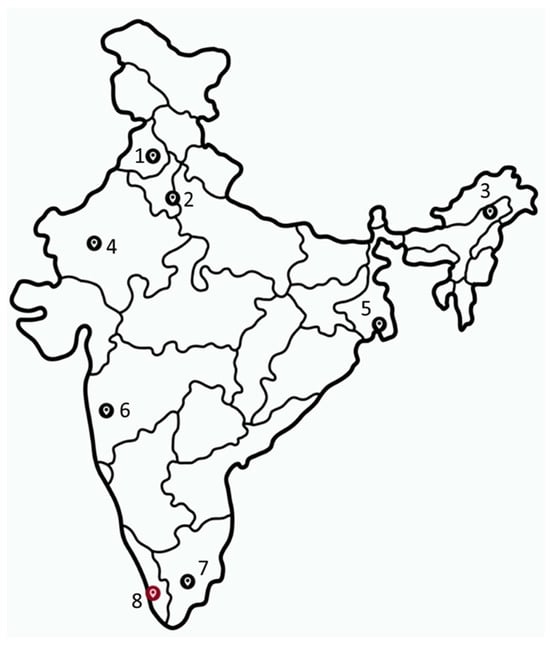 Map of India showing collection sites. Red indicates the site for only the Ae. albopictus collection. 1: Patiala, Punjab; 2: New Delhi; 3: Dibrugarh, Assam; 4: Jodhpur, Rajasthan; 5: Kolkata, West Bengal; 6: Pune, Maharashtra, 7: Madurai, Tamil Nadu, 8: Alappuzha, Kerala. Map source: vecteezy.com (accessed on 15 October 2023).