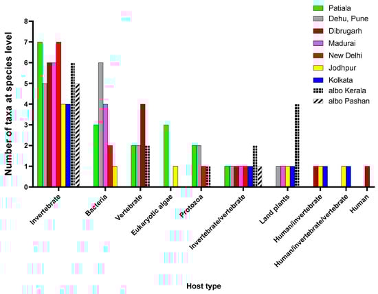 The host type showing the most abundance of viral taxa represented invertebrates, indicating a dominance of ISVs (Figure 2). Among the analyzed viromes, mosquitoes collected from Patiala and New Delhi represented the most ISVs. There were also viruses that had both invertebrates and vertebrates, including humans, as hosts. Shamonda orthobunyavirus (SHAV) and African swine fever virus (ASFV), known to infect both invertebrate and vertebrate hosts, were detected in Ae. albopictus mosquitoes from Kerala, while Ilheus virus (ILHV), capable of infecting both humans and invertebrates, were found in Ae. aegypti mosquitoes obtained from Dibrugarh, Jodhpur and Kolkata, though with few reads. Considering the abundance of RNA viruses identified through our protocol and the low number of reads classified as ILHV, it is unlikely that a viable infectious virus was actually present; therefore, it warrants further studies for confirmation. Similarly, Aroa virus (AROAV), a virus capable of infecting invertebrate and vertebrate hosts was detected in Ae. aegypti mosquitoes collected from Jodhpur and Kolkata, albeit with very few read numbers.