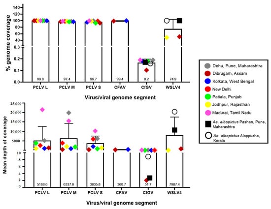 Figure 4 depicts the percent genomic coverage and depth, i.e., the number of times the entire genome or sequenced part of the genome was covered in the analyzed viromes. Nearly full genome coverage was achieved for PCLV from the sequences generated in this study, with an average of 96.7%, 97.4%, and 99.8% for L, M, and S segments, respectively. While the coverage values were relatively uniform throughout the analyzed viromes, there were intra-location and intra-segment variations in the depths of coverage, i.e., the L segment of PCLV had a read depth varying from 982 in the Jodhpur mosquito virome to 21,494.6 in the Madurai virome. Similarly, the Pune mosquito virome yielded a depth of 5149.21, 6159.9, and 19840.7 for segments L, S, and M, respectively. The varying trend of read depth may be due to the varying efficiency of the SISPA protocol. For CfGV, despite being present in all analyzed Aedes viromes, genomic coverage was almost negligible (0.2% on average), albeit with an average depth of sequence coverage of 51.7 (with Dibrugarh and Pune Ae. albopictus mosquitoes showing the lowest depth values). WSLV4 interestingly had an almost complete genome coverage in Ae. albopictus virome data, with Pune and Kerala having depths of 10,732 and 20,405, respectively. Jodhpur and Dibrugarh Ae. aegypti viromes showing hits of WSLV4 had depths of coverage of 11.08 and 801.22, respectively. For CFAV, mosquitoes from Kolkata and Dibrugarh showed genome coverage depth of 443.69 and 277.78, respectively, with nearly 100% coverage for genomes. For New Delhi and Patiala mosquitoes, it was not possible to derive a complete consensus genomic sequence.