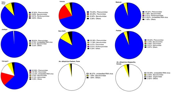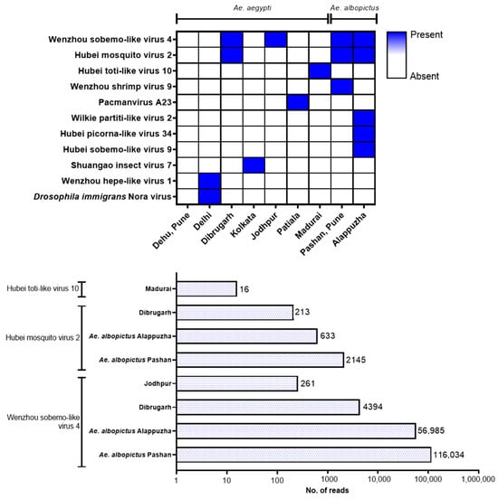 The Dibrugarh mosquito virome had the highest percentage (~12%) of reads matching unclassified viruses, amongst a total of 38,089 viral reads, while the virome of Pune Ae. aegypti mosquitoes lacked any reads matching unclassified viruses despite having relatively high viral reads (276,367) (Table 2). In contrast, Pune Ae. albopictus virome harbored the highest percentage of unclassified virus reads (~97%) with total viral reads of 122,369. This makes the absence of unclassified virus reads in Pune Ae. aegypti virome is an exceptional occurrence and warrants further investigation.