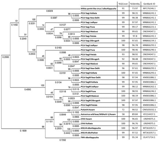 The L, M, and S segments formed three distinct clades (Figure 7). There appeared to be no subclades except for the repeated clustering together of sequences from New Delhi and Kolkata. The M and L segment sequences yielded query coverage of 98–100%, whereas the S segment had a slightly lower coverage, ranging from 90% to 100%. PCLV sequences from Kolkata and New Delhi appeared to have some distinct evolutionary characteristics. The host range of PCLV being limited only to Ae. aegypti is also supported by data presented in our study (Figure 3). PCLV formed a distinct clade from all the other viral consensus FASTA sequences analyzed in this study (Figure 7), with the sole exception of Wilkie partiti-like virus-2. Notably, Wilkie partiti-like virus-2 sequence from Kerala Ae. albopictus mosquitoes clustered along with the PCLV L and M sequences. However, a paired BLAST of both sequences gave no significant similarity, even with the least stringent parameters. Global Alignment using the Needleman–Wunsch algorithm also yielded only 50% identity [19]. It showed a high query coverage of 91% but a relatively low PNI (73.97%) with GenBank reference sequence MF176346.1 (Wilkie partiti-like virus-2 strain mosWSCP53020, complete genome).