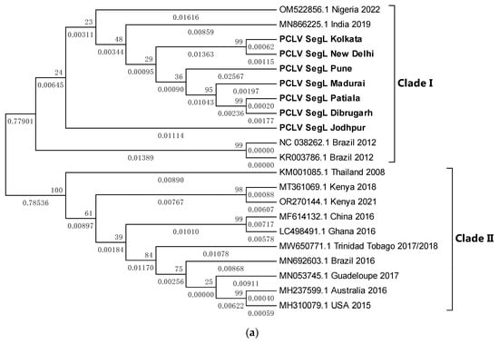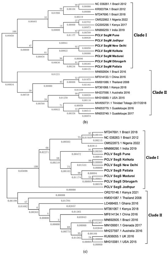 Overall, PCLV L, M, and S segment sequences formed two distinct clades. Indian PCLV sequences clustered together in a single clade, which also included sequences from Nigeria (for the L segment), Nigeria, Brazil, and Kenya (for the M segment), and Nigeria and Brazil (for the S segment). Clade II of L segment sequences included sequences from Thailand, Kenya, China, Ghana, Trinidad and Tobago, Guadeloupe, Australia, the USA, and Brazil (2016) (Figure 8a); of M segment sequences (Figure 8b) included Brazil, China, Thailand, Kenya, Australia, the USA, Trinidad and Tobago, and Guadeloupe; and of S segment sequences (Figure 8c) included Kenya, Thailand, Ghana, China, Brazil, Grenada, Australia, the United Kingdom, and the USA.