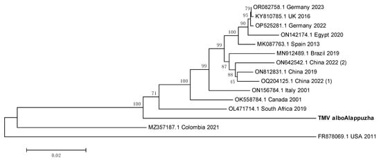 The whole genome sequence of TMV from Kerala Ae. albopictus mosquitoes was used to construct a phylogenetic tree (Figure 9). The Indian sequence seemed to have the least ED with the South African sequence from 2019 (OL471714.1) and may thus be the most evolutionarily related to it.