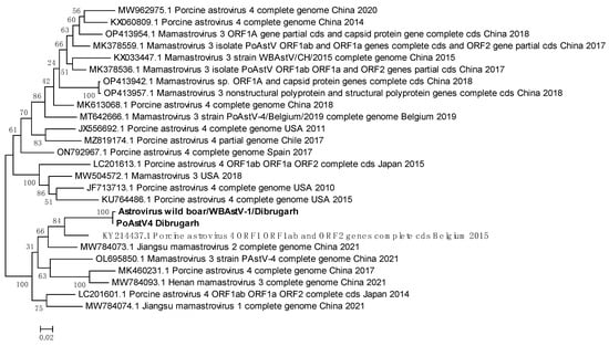 Maximum Likelihood phylogenetic tree of the Porcine astrovirus-4 and Wild Boar astrovirus genomic sequences: The tree is displayed in the topology-only format and was constructed using Tamura 3-parameter, with 1000 bootstrap replicates on MEGA v.5.2 software. Values at nodes represent the bootstrap support. The scale represents evolutionary distance in terms of base substitutions per site. Names of countries from which the samples were collected, and the year of sample collection (or sequence submission) are mentioned, along with the GenBank accession number for each reference. ORF: open reading frame, cds: coding DNA sequence, PoAstV/PAstV: porcine astrovirus, WBAstV: wild boar astrovirus, sp.: species.