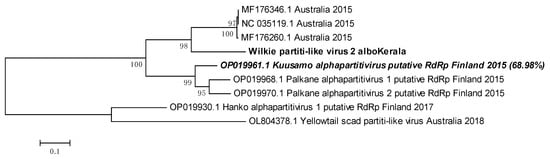 Wilkie partiti-like virus-2 genomic sequence with 91% coverage was obtained from Kerala Ae. albopictus mosquitoes. Since the virus is unclassified, we used the next most identical nucleotide sequences from viruses as found through BLAST for phylogenetic tree building (Figure 11). PNIs of our sequence with already available Wilkie partiti-like virus-2 sequences were relatively low, with none above 73.97% in the phylogenetic tree analysis. Wilkie partiti-like virus-2 sequence from Kerala Ae. albopictus clustered together with three other sequences in the same clade. The other viruses used in the analysis were found using the Discontiguous Megablast option in the BLAST suite. Palkane alphapartitivirus-2 (OP019970.1) and Kuusamo alphapartitivirus (OP019961.1) had similar PNIs as the Kerala virus sequence (68.99% and 68.98%, respectively). Nevertheless, it was difficult to draw a meaningful conclusion regarding the taxonomic placement of this virus.