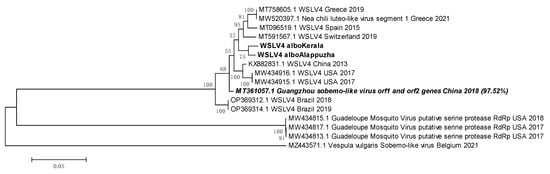 WSLV4 sequences from Ae. albopictus mosquitoes of Kerala and Pune were used to construct a phylogenetic tree (Figure 12). The Indian sequences clustered tightly. The least ED was shown with a sequence from China, 2013 (KX882831.1). China has the closest geographic proximity to India out of all the source locations of the WSLV4 reference sequences in the tree. At the same time, Indian WSLV4 sequences showed close evolutionary relationships and low EDs with existing WSLV4 sequences, and sequences from two other viruses, the Nea chili luteo-like virus and the Guangzhou sobemo-like virus, also clustered with the WSLV4 sequences. This made the deduction of possible taxonomic placement of WSLV4 ambiguous. BLAST analysis of the sequence derived from Pune Ae. albopictus mosquitoes showed PNIs of 97.52% with the Guangzhou sobemo-like virus and 97.24% with the Nea chili luteo-like virus. Despite the PNI difference being marginal, we may infer that the WSLV4 is more closely related to the Guangzhou sobemo-like virus, which belongs to the family Solemoviridae, and the Nea chili luteo-like virus, belonging to order Tolivirales. While this is an inference drawn from nucleotide sequences, more investigation based on morphology, ultrastructure, and antigenicity is needed for confirmation.
