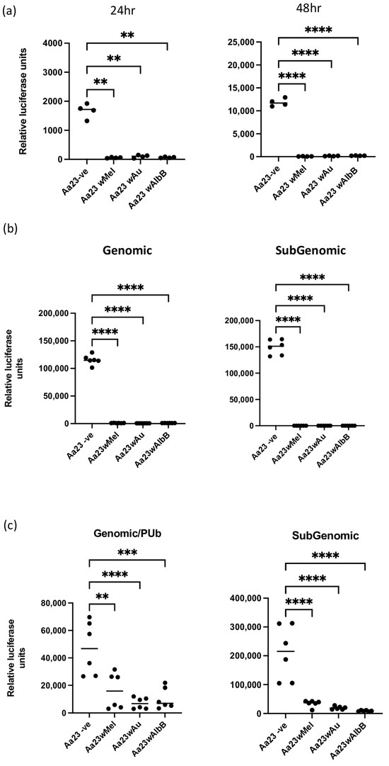 Ae. albopictus (Aa23) cells naturally infected with wAlbB, transinfected with wMel or wAu or cleared of Wolbachia were first infected with reporter virus SFV4(3H)-FFLuc [26], whereby luciferase expression acts a proxy for viral replication, at an MOI of 0.1. Luciferase activity and therefore viral replication were measured at 24 and 48 h post infection (hpi). In Wolbachia-cleared cells, luciferase activity was high at 24 hpi and increased by a log10 at 48 hpi, clearly showing viral replication. However, in cells containing any of the three Wolbachia strains, luciferase activity was significantly reduced to close to background levels at both time points, indicating strong inhibition of SFV replication/translation (Figure 1a).