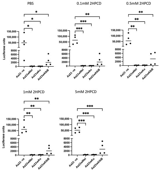 2HPCD does not rescue Wolbachia-mediated inhibition of SFV. Aa23 cells cleared of Wolbachia or carrying wMel, wAlbB or wAu strains were treated with PBS or differing concentrations of 2HPCD for 48 h prior to infection with 0.1 MOI of SFV4(3H)-FFLuc. At 48 hpi, luciferase assays were carried out to determine levels of SFV4(3H)-FFLuc. Each graph shows 2 independent experiments carried out in duplicate. Y axis represents relative light units/55,000 cells. Statistical significance was determined via an ordinary one-way ANOVA. Plots have statistical significance indicated as follows: * p < 0.05, ** p < 0.01 and *** p < 0.001.