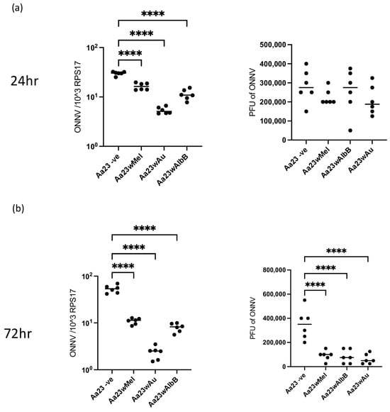 RNA and DNA from Aa23 cells (Aa23wAlbB, Aa23wAu, Aa23wMel and Aa23) and Ae. aegypti mosquitoes (wildtype, wMel, wAu and wAlbB) infected with ONNV virus were utilised to measure viral RNA, and Wolbachia DNA was carried out via RT-qPCR or qPCR as previously described [20,25].