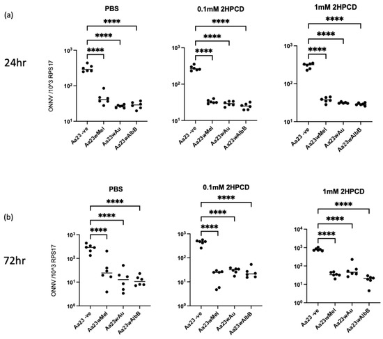 2HPCD does not rescue Wolbachia -mediated inhibition of ONNV virus. Aa23 cells cleared of Wolbachia or carrying wMel, wAlbB or wAu strains were treated with PBS or differing concentrations of 2HPCD for 48 h prior to infection with ONNV at an MOI of 0.1. At 24 (a) and 72 (b) hpi, cells were collected, and level of viral RNA was measured by RT-qPCR. Each graph shows 3 independent experiments carried out in duplicate. Statistical significance was determined via an ordinary one-way ANOVA. Plots have statistical significance indicated as follows: **** p < 0.0001.