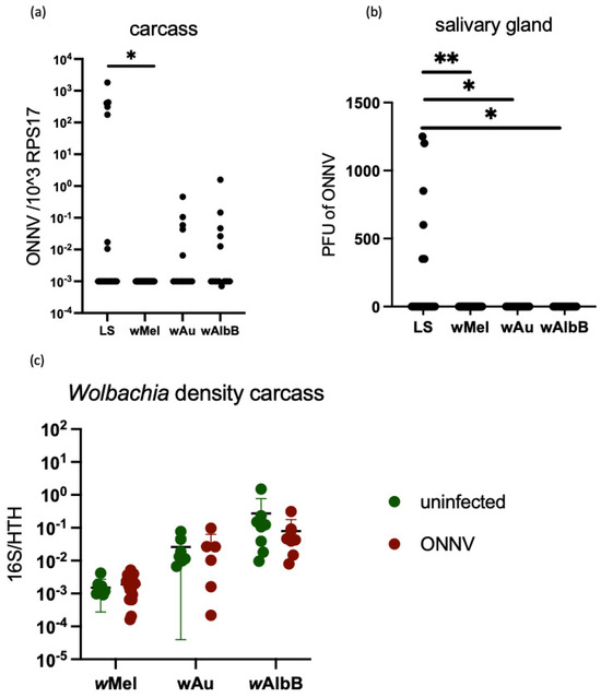 To determine if the stable transinfection of Wolbachia in Ae. aegypti leads to the inhibition of ONNV infection, 4–5-day-old female mosquitoes stably transinfected with either wMel, wAu or wAlbB and the native Wolbachia-free line (LS) were infected with ONNV via an infectious bloodmeal. Dissemination of infectious virus to the salivary glands and viral RNA levels in the remaining carcass were measured at 12 days post infection. 36.8% (7 of 19) of the lab strain (LS) Wolbachia-free LS line became infected with ONNV, and 31.5% (6 of 19) had infectious particles in the salivary glands (Figure 5a,b). Viral RNA was undetectable in wMel mosquitoes, and both wAlbB and wAu showed a lower level of viral RNA than LS, although the difference was not significant (Figure 5a). Dissemination of infectious particles to the salivary glands was completely blocked by all three strains of Wolbachia, with no plaques detected via plaque assay (Figure 5b). ONNV infections had no effect on the density of Wolbachia within the mosquitoes (Figure 5c).
