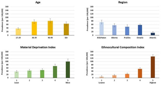 In our study, both chronic and resolved hepatitis B infections were associated with living in more materially deprived neighbourhoods independent of ethnocultural composition. An association between lower socioeconomic status and chronic hepatitis B has been noted in studies in British Columbia and Ontario [8,21]. People with lower socioeconomic status tend to have poorer health literacy and, thus, less understanding of risk factors and poorer access to healthcare [28,29,30]. Consistent with HBV reported case prevalence, resolved infection prevalence was higher in the western provinces of British Columbia and Alberta and lower in the Atlantic region after considering ethnocultural composition and material deprivation [17].