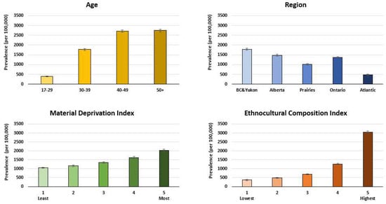 Chronic hepatitis B prevalence by age group, region, material deprivation index, and ethnocultural composition index (2005–2022) (850 chronic HBV cases of 1,539,869 first-time donors).