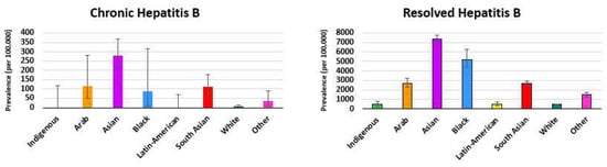 The following supporting information can be downloaded at: https://www.mdpi.com/article/10.3390/v16010117/s1, Table S1. Output from simple logistic regression model with chronic hepatitis B as the dependent variable and race/ethnicity as the independent variable. Table S2. Output from simple logistic regression model with resolved hepatitis B as the dependent variable and race/ethnicity as the independent variable.