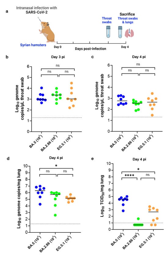 Viral loads in the throat swabs and lungs of Syrian hamsters following infection with different omicron SARS-CoV-2 variants. (a) Set-up of the Syrian hamster infection study. (b,c) Viral RNA levels in the throat swabs of hamsters infected with 104 TCID50 of BA.5, BA.2.86 or EG.5.1 omicron SARS-CoV-2 variants on day 3 and day 4 post infection (pi), respectively, are expressed as log10 SARS-CoV-2 RNA copies per µL throat swab. (d) Viral RNA levels in the lungs of infected hamsters on day 4 pi are expressed as log10 SARS-CoV-2 RNA copies per mg lung tissue. Individual data and median values are presented. (e) Infectious viral loads in the lungs of infected hamsters on day 4 pi are expressed as log10 TCID50 per mg lung tissue. Individual data and median values are presented. Data were analyzed with the Kruskal–Wallis test, * p < 0.05, **** p <0.0001, ns = non-significant. Dotted lines represent limit of quantification. All data are from 2 independent experiments with n = 8 per group.