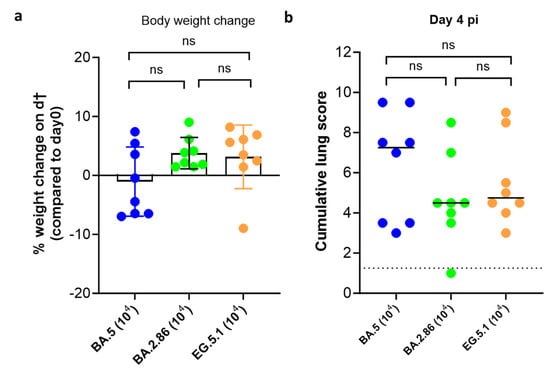 Although no significant differences in body weight change (on day 4 compared to day 0) was noted between the three variants groups (Figure 2a), the group infected with BA.5 presented with the lowest body weight gain profile (with average weight change of -1%). The average % body weight change for groups infected with BA.2.86 and EG.5.1 were 3.8 and 3.1%, respectively (Figure 2a). Moreover, the median cumulative lung pathology scores for BA.2.86 (median score of 4.5)- and EG.5.1 (median score of 4.75)-infected animals were markedly lower as compared to the scores in animals infected with BA.5 (median score of 7.25) (Figure 2b, Table 1). A recent study revealed that BA.2.86-infected hamsters in general has significantly lower viral RNA loads in oral swabs and lungs compared to EG.5.1-infected hamsters on day 2 and 5 pi. No infectious virus loads were quantified in that study []. However, in our model, the only remarkable difference between these two sub-variants was in the infectious virus loads in the lungs of the infected animals (both on days 3 and 4 pi).