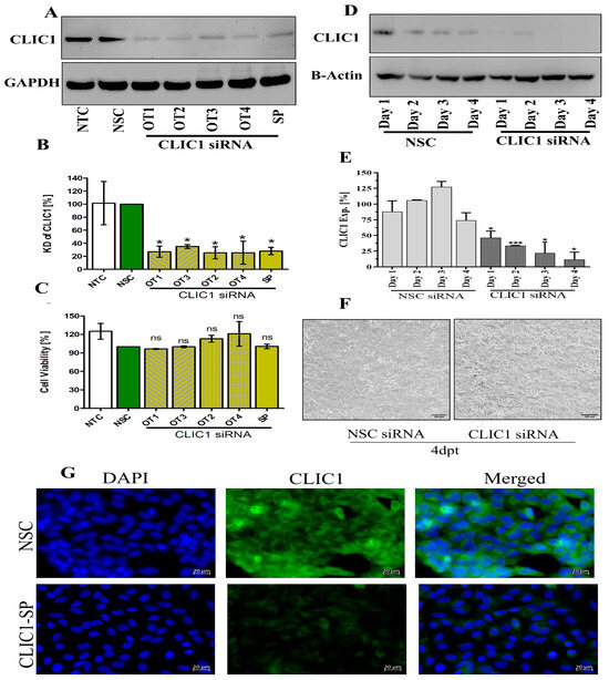 Optimization of CLIC1 knockdown by siRNA transfection in A549 cells. (A) Expression of CLIC1 protein was detected by Western blot after 48 h of treatment with 50 nM OT and SP CLIC1 siRNA. (B) Quantitative expression of CLIC1 from Western blots after OT and SP CLIC1 siRNA treatment. (C) Cell viability of A549 cells after 48 h of siRNA transfection. (D) Expression of CLIC1 detected by Western blot up to 4 days after 50 nM SP CLIC1 siRNA treatment. (E) Quantitative expression of CLIC1 from Western blot images after treatment with 50 nM CLIC1 siRNA up to 4 dpt. (F) Photomicrographs of A549 cells showing the impact of siRNA treatment on A549 cell phenotypes at 4 dpt with 50 nM CLIC1 siRNA treatment; scale bars are 100 µm. (G) CLIC1 KD was confirmed in CLIC1 siRNA-treated cells by immunofluorescence microscopy (scale bar is 20 µm). DAPI was used to visualize the cell nuclei. ns = Not significant. *: p < 0.05, ***: p < 0.001.