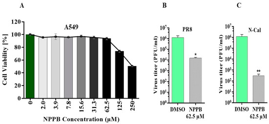 Chloride channel inhibitor NPPB suppresses the replication of IAV. (A) The cytotoxicity of NPPB was determined by treating A549 cells with different concentrations of the drug and cell viability was measured by WST-1 assay. To determine the impact of the NPPB drug on virus replication, A549 cells were pre-treated with the drug and infected with IAV PR8 and N-Cal strains at MOI = 0.01. The drug was also added to the overlay media after infection. PR8 and N-Cal were collected at 45 hpi. Impact of NPPB on (B) PR8 and (C) N-Cal replication in A549 cells. The light or dark green colour bar represents the DMSO control, and the lower to higher darker grayscale gradient bars represent the low to a high concentration of NPPB. Replicates: n = 3. *: p <0.05, **: p < 0.01.