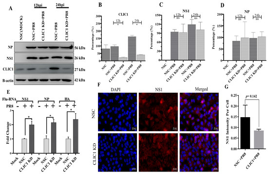 To identify the specific step(s) in IAV replication that CLIC1 KD impacted since IAV progeny virus production was drastically reduced in CLIC1 KD cells, we started by evaluating the effect on viral protein translation. CLIC1 KD and NSC A549 cells were infected with PR8 at MOI = 3. At 12, 24, 36, and 48 hpi, infected cells were collected. Western blot analyses of cell lysates were done to detect the expression profiles of IAV-NS1, IAV-NP, and CLIC1 proteins (Figure 4A). Quantification of band intensities from Western blots (Figure 4B) confirmed a significant decrease in CLIC1 expression. The CLIC1 KD had no significant effect on viral protein expression (Figure 4C,D). Then, we investigated the effect of CLIC1 KD on total viral RNAs by using RT-qPCR. RNA was obtained from NSC and CLIC1 KD cells at 24 hpi after PR8 infection at MOI = 3. Reverse transcription was used to create the cDNA, and qPCR was run using viral NS1, NP, and HA RNAs as the targets. Total NS1, NP, and HA RNAs were significantly higher in CLIC1 KD cells (Figure 4E). The effect of CLIC1 KD on the localization of viral proteins was further examined by infecting CLIC1 KD and NSC cells at MOI = 3 and fixing the cells 24 h later. IAV-NS1 protein was visualized using immune fluorescence microscopy in NSC and CLIC1 KD cells after IAV infection. Interestingly, the IAV-NS1 protein intensity was not significantly affected by IAV infection in CLIC1 KD cells compared to the NSC cells (Figure 4F,G).