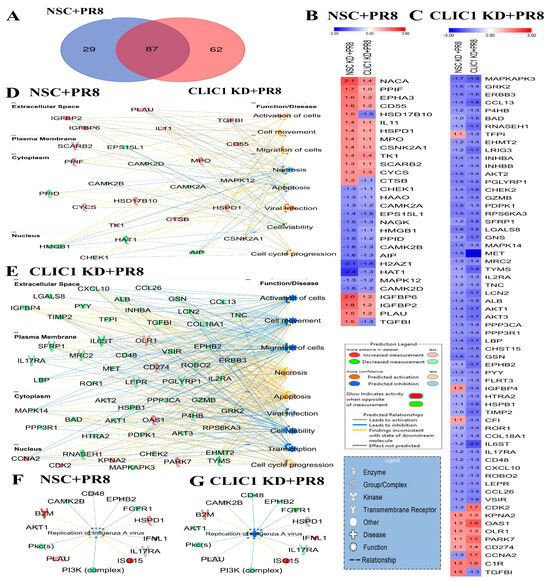 Impact of CLIC1 KD on the A549 cellular proteome during IAV infection. (A) Venn diagram showing the numbers of proteins dysregulated in non-silencing control (NSC + PR8) and CLIC1 KD cell (CLIC1 KD + PR8) after PR8 infection. (B) Heatmap of the proteins significantly dysregulated only in NSC + PR8 cells but not significantly impacted in CLIC1 KD + PR8 cells. (C) Heatmap of the proteins significantly dysregulated only in CLIC1 KD + PR8 cells but not significantly impacted in NSC + PR8 cells. Red: up-regulated; Blue: down-regulated. The numbers inside the boxes indicate the fold change expression values of the proteins. (D) Association of the proteins dysregulated only in NSC + PR8 cells with cellular functions. (E) Association of the proteins dysregulated only in CLIC1 KD + PR8 cells with cellular functions. IPA predicted the impact of dysregulated protein expression on IAV replication in (F) NSC + PR8 and (G) CLIC1 KD + PR8 cells.