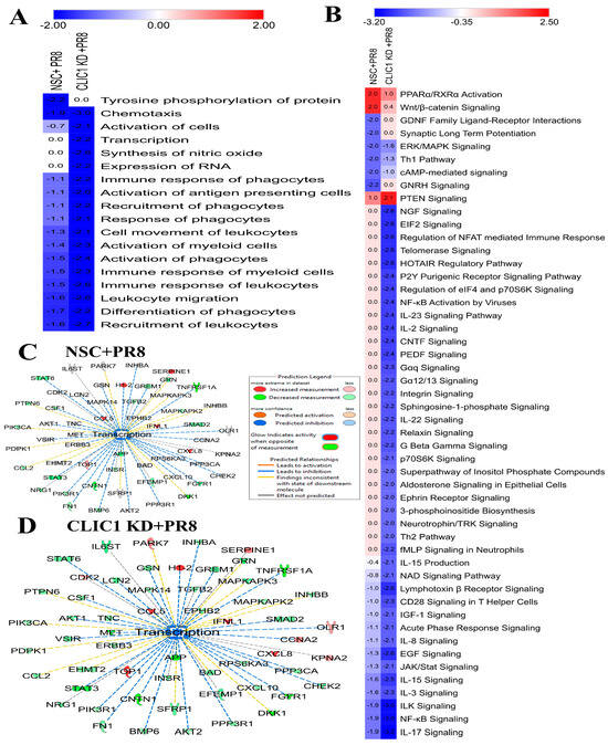 Impact of CLIC1 KD on cellular functions and signaling pathways in A549 during IAV infection. (A) Heatmap of cellular functions that were significantly dysregulated only by NSC or CLIC1 KD cells after IAV-PR8 infection. Numbers in the boxes indicate the activation/inactivation Z scores. (B) Heatmap of the signaling pathways significantly dysregulated only in NSC + PR8 or CLIC1 + PR8 cells. Numbers in the boxes indicate the activation/inactivation Z scores. Red: Activated; Blue: inhibited. (C) Impact of PR8 infection on cellular transcription process predicted by IPA analysis based on the significantly dysregulated proteins only in (C) NSC or (D) CLIC1 KD cells.