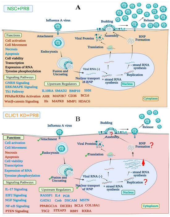 Proposed model showing the role of CLIC1 in IAV replication. (A) The replication cycle of IAV and effect of IAV infectionon cell function, signaling pathways and upstream regulators (B) Impact of CLIC1 KD on IAV replication and cellular function, signaling pathways and upstream regulators. Viral protein translation was not affected by CLIC1 KD, which indicates that earlier steps in IAV replication cycle, e.g., attachment, endocytosis, fusion, nuclear transport, and mRNA synthesis, should also be unaffected. A higher number of total viral RNAs were detected in the CLIC1 KD cells after PR8 infection, indicated by red arrow. However, we detected a significantly lower number of progeny viruses in the supernatant of CLIC1 KD cells compared to control. This suggests that CLIC1 is required in later stage(s) of viral replication. Activation and inhibition of cellular function, signaling pathways and upstream regulators were indicated by the front colors. Red: activated/up-regulated, Blue: suppressed/down-regulated and Black: unaffected. Green tick marks show the stages of IAV replication was not affected by CLIC1 knockdown The red question mark indicates the possible effect CLIC1 KD on stages of IAV replication.