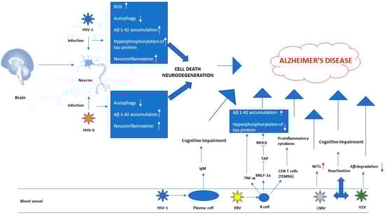 Role of herpesviruses in Alzheimer’s disease. Where there is no explanation next to it, the arrow with the tip indicates activation, the arrow without the tip indicates inhibition. The red up arrow indicates increase, while the red down arrow indicates decrease. Abbreviations: ROS, reactive oxygen species; TAP, transporter protein; NFTs, neurofibrillar tangles.