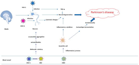 The indirect effect is based on the viral induction of peripheral inflammation, a role mostly played in AD. The brain interacts with the periphery through the neuronal and humoral pathways []. In PD pathogenesis, autoimmune mechanisms induced by molecular mimicry between some herpesviruses and alpha-synuclein are postulated [] (Figure 1 and Figure 2).