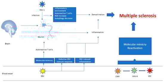 Among the herpesviruses, EBV is one that has been investigated the most for its role in triggering MS. Different mechanisms have been considered, such as molecular mimicry, defective EBV immune responses, and EBV-induced inflammation.