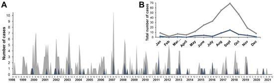 Seasonal distribution of AFP cases with NPEV shedding (gray) and with NPEV shedding, fever at onset, and residual paralysis (blue): (A) AFP cases distribution by month from 1998 to 2021; (B) total monthly distribution of AFP cases with NPEV isolation from 1998 to 2021. Gray—total number of cases, blue—cases with fever and residual paralysis (60 days after onset) clinically compatible with paralytic forms of poliovirus infection.