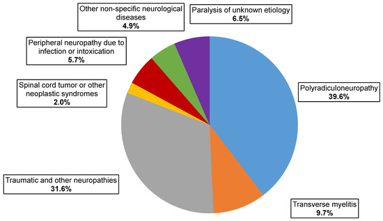 Final diagnosis data were available for 247 AFP cases, yielding CPE agents that were investigated by the National Commission for Diagnosis Poliomyelitis and AFP. The distribution of AFP cases with NPV isolation by clinical diagnosis showed that the most common were polyradiculoneuropathy, including Guillain–Barré syndrome (98 cases, 39.6%), mononeuropathies, including traumatic ones (78 cases, 31.6%), and myelitis (24 cases, 9.7%) (Figure 3). The same ratio of clinical diagnoses was observed over the same period among all cases of AFP according to the State Sanitary and Epidemiological Surveillance (Rospotrebnadzor)—41%, 32.9%, and 8.8%, respectively.
