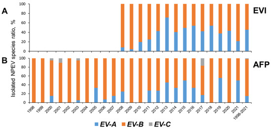 NPEV species isolated from cases of enteroviral infection (EVI, (A)) (data from the Reference Center for the Monitoring of Enteroviral Infections in the Federal Budgetary Science Institute “Academician I.N. Blokhina Nizhny Novgorod Scientific Research Institute of Epidemiology and Microbiology”) and acute flaccid paralysis (AFP, (B)).