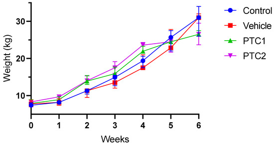 Weekly weight gain increased steadily over the course of the experiment in the four groups. There were non-significant differences observed between the PBS and vehicle groups compared to the PTC1 and PTC2 groups (Figure 1).