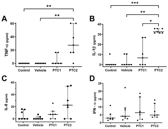 Analysis of proinflammatory cytokines in serum from pigs immunized with PTC1 and PTC2. Serum samples were collected 48 h post-inoculation. Cytokines were measured using a multiplex Luminex-based cytokine immunoassay. (A) TNF-α. (B) IL-1b. (C) IL-8. (D) IFN-α. Bars indicate the median of 7 individual subjects and the error bars represent the interquartile range. Statistical significance was determined using ANOVA and Kruskal–Wallis post hoc test. Significance levels of * p < 0.05, ** p < 0.01, and *** p < 0.001 were considered statistically significant. ns: non-significant.