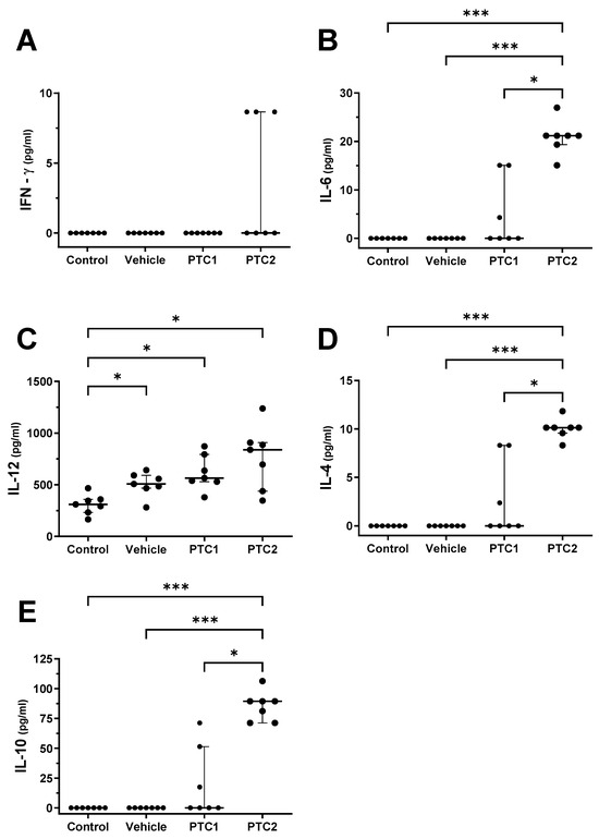 Immunization with PTC2, after 2 DPI or 48 h, corresponded to an elevated serum concentration of cytokines related to the Th1 and Th2 immunological response (Figure 3). Specifically, the higher concentration of IFN-γ and IL-12 is associated with the activation of helper lymphocytes of the Th1 lineage [52], whereas the higher concentration of IL-4 and IL-6 suggests the stimulation of Th2 lymphocytes [53,54].