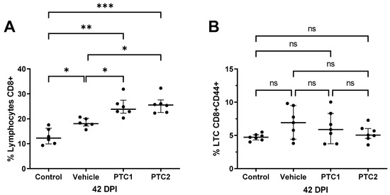 Analysis of T-lymphocyte, CD8+, and CD8+CD44+ cell populations from pigs at 42 DPI. (A) Percentage of total cytotoxic cell population CD8+ and (B) percentage of total activated cytotoxic cells CD8+CD44+. Bars indicate the median of 7 individual subjects and the error bars represent the interquartile range. Statistical significance was determined using ANOVA and Brown–Forsythe and Welch post hoc tests. Significance levels of * p < 0.05, ** p < 0.01, and *** p < 0.001 were considered statistically significant. ns: non-significant.