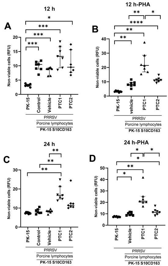PRRSV peptide-specific CTL responses in vitro. PK-15 S10-CD163 cells were seeded at a ratio of 1:8 with isolated lymphocytes from immunized pigs according to the experimental groups: control, vehicle, PTC1, and PTC2. Additionally, lymphocytes from the vehicle, PTC1, and PTC2 were pre-activated with PHA in vitro for 24 h before co-cultivation. (A) RFU measurement at 12 h of co-culture. (B) RFU measurement at 12 h of co-culture with pretreated lymphocytes with PHA. (C) RFU measurement at 24 h of co-culture. (D) RFU measurement at 24 h of co-culture with pretreated lymphocytes with PHA. Bars indicate the median of 7 individual subjects, and the error bars represent the interquartile range. Statistical significance was determined using ANOVA and Brown–Forsythe and Welch post hoc tests. Significance levels of * p < 0.05, ** p < 0.01, *** p < 0.001, and **** p < 0.0001 were considered statistically significant. ns: non-significant.