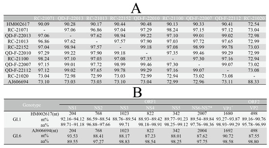 Evolutionary divergence between nine local strains and corresponding genotype prototype strains. (A) Nucleotide identity (%) between local strains based on the whole genome and corresponding genotype prototype strains; (B) identity analysis between local strains and corresponding genotype prototype strains based on different genes; *, in the NS6-NS7 region, eight local strains of the GI.1 type showed a deficiency in the 590th amino acid position compared to the prototype strain HM002617; + in the VP1 region, GI.1 SaV has 1680 nucleotides encoding 559 amino acids, while GI.6 SaV has 1692 nucleotides encoding 563 amino acids.