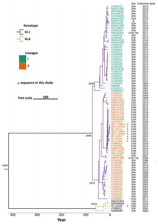 In this study, a total of 86 SaV strains were included, and their whole genome sequences were used to estimate the molecular evolutionary rate and the time to the most recent common ancestor (tMRCA). The average molecular evolutionary rate for the 86 virus strains was 2.099 × 10−3 substitutions/site/year (95% highest posterior density interval: 1.143 × 10−3~2.761 × 10−3), with a tMRCA estimated to be around 1604. For the 73 GI.1 SaV strains, the average molecular evolutionary rate was 2.092 × 10−3 substitutions/site/year (95% HPD: 1.484 × 10−3~2.739 × 10−3), and the tMRCA was estimated to be around 1949. The average molecular evolutionary rate for the 5 GI.6 SaV strains was 6.881 × 10−3 substitutions/site/year (95% HPD: 1.874 × 10−5~2.930 × 10−2), with a tMRCA estimated to be around 1953. For the 36 GI.1 Lineage I strains, the average molecular evolutionary rate was 1.603 × 10−3 substitutions/site/year (95% HPD: 6.597 × 10−4~2.737 × 10−3), and the tMRCA was estimated to be around 1959. The average molecular evolutionary rate for the 45 GI.1 Lineage II strains was 2.082 × 10−3 substitutions/site/year (95% HPD: 1.569 × 10−3~2.653 × 10−3), with a tMRCA estimated to be around 1974, as shown in Table 2.
