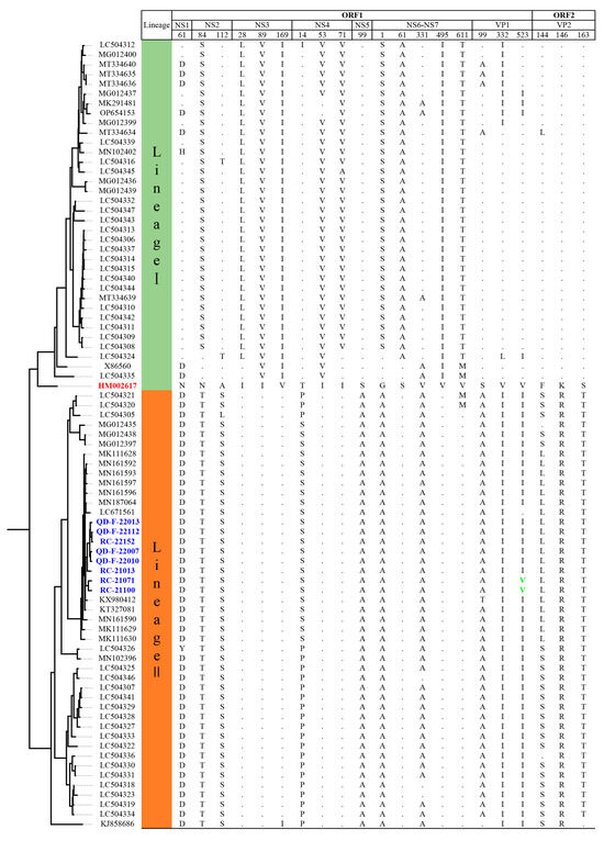 After analyzing the amino acid variations in the above 81 GI.1 strains of SaV according to different genes, we discovered that the major reason for the division of GI.1 SaV into two lineages was due to variations at 21 amino acid positions, as shown in Figure 5. These positions were located at amino acid 61 in the NS1 gene, amino acids 84 and 112 in the NS2 gene, amino acids 28, 89, and 169 in the NS3 gene, amino acids 14, 53, and 71 in the NS4 gene, amino acid 99 in the NS5 gene, amino acids 1, 61, 331, 495, and 611 in the NS6-NS7 gene, amino acids 99, 332, and 523 in the VP1 gene, and amino acids 144, 146, and 163 in the VP2 gene.