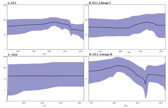 Bayesian Skyline Plot (BSP) of SaV. (A), all GI.1 SaV (B), Lineage I of GI.1 SaV (C), Lineage II of GI.1 SaV and (D), all GI.6 SaV. The x-axis represents the time in years; the y-axis represents the effective population size; the black solid line represents the median posterior value; and the blue area represents the 95% highest probability density (HPD) interval.