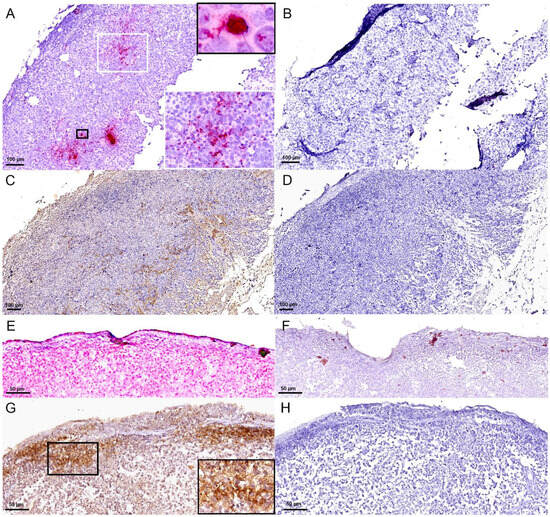 DCH infection in cats with lymphoma. Lymph node: cat no. 3 (A–D) and cat no. 4 (E,F). (A) Multifocal, strong red dot-like pattern of DCH DNA in the lymphoma section (white inset). Prominent nuclear labeling of DCH DNA (black inset). (B) No DCH DNA hybridization presented in the DCH qPCR-positive lymphoma section incubation with feline bocavirus-3 DNA probe. In situ hybridization (ISH) of DCH (A,B). (C) Multifocal immunolabelling (brownish color) of DCH core protein presented in the lymphoma section. No immunoreactivity was present in the DCH qPCR-positive lymphoma section incubation with normal rabbit IgG antibody. Horseradish peroxidase immunohistochemistry (IHC) (C,D). (E) Diffuse, intense hybridization signals in the lymphoma section. (F) No specific hybridization reactions were presented in the cellular morphology of the negative control section. DCH ISH (E,F). (G) Multifocal, cytoplasmic labeling (inset) of DCH core protein in the lymphoma section by IHC. (H) No labeling was observed in the negative control section. IHC for DCH core protein (G,H).