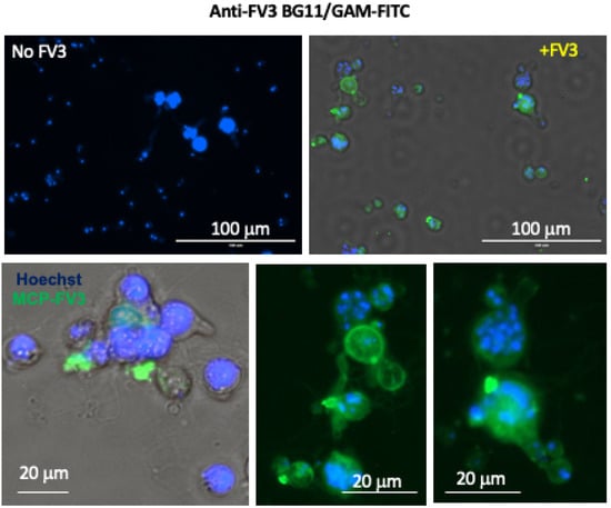 To examine possible direct interaction between FV3 and Bd pathogens, we first determined whether FV3 could bind to Bd. For this purpose, Bd (zoosporangia and zoospores) was incubated with FV3 and used a monoclonal Ab (BG11) that recognizes the major capsid protein (MCP) of FV3. Significant positive signal was detected on the Bd by fluorescence microscopy indicating that indeed a substantial fraction of FV3 did bind to Bd (Figure 1).